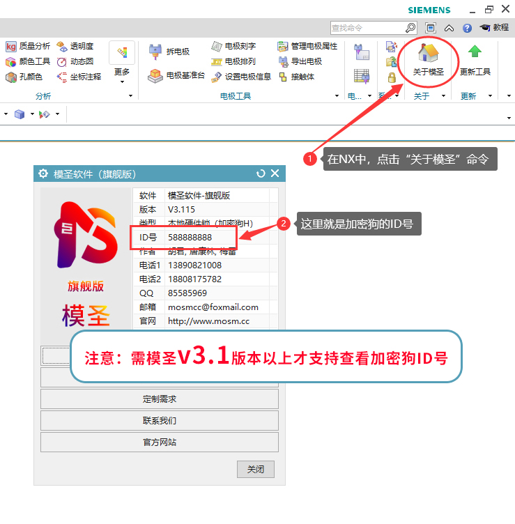 2,另外一种加密狗可以在NX里面,点击“关于模圣”命令,即可看到ID编号(如下图)