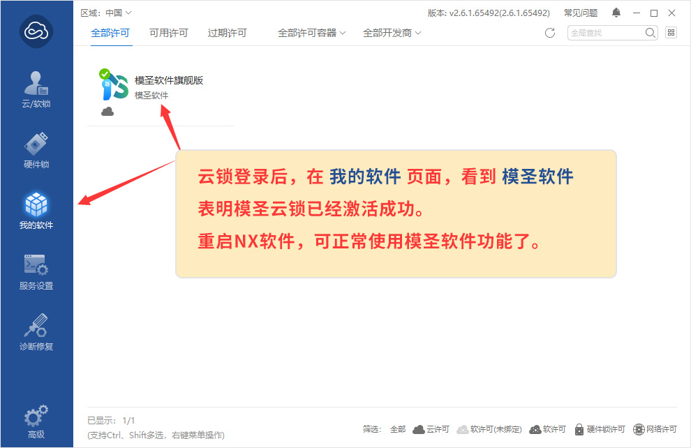 模圣软件云锁激活使用步骤:
